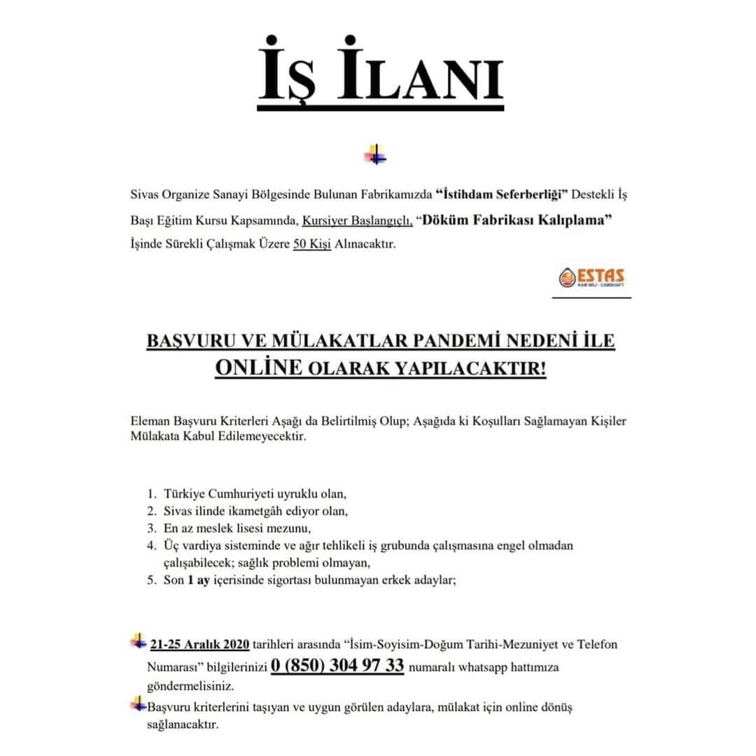 ESTAŞ, 21-25 Arallık arasında 50 işçi daha alacak. Salgın nedeniyle internet üzerinden başvuru alacak olan Estaş, işsiz olanlara iş kapısı aralayacak.