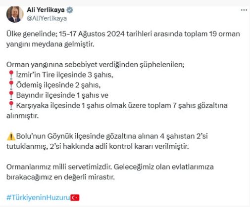 Son dakika haberine göre, İçişleri Bakanı Ali Yerlikaya İzmir'de çıkan yangınlardan sorumlu tutulan 7 şüphelinin gözaltına alındığını, Bolu'daki yangınla ilgili ise 2 kişinin tutuklandığını duyurdu.