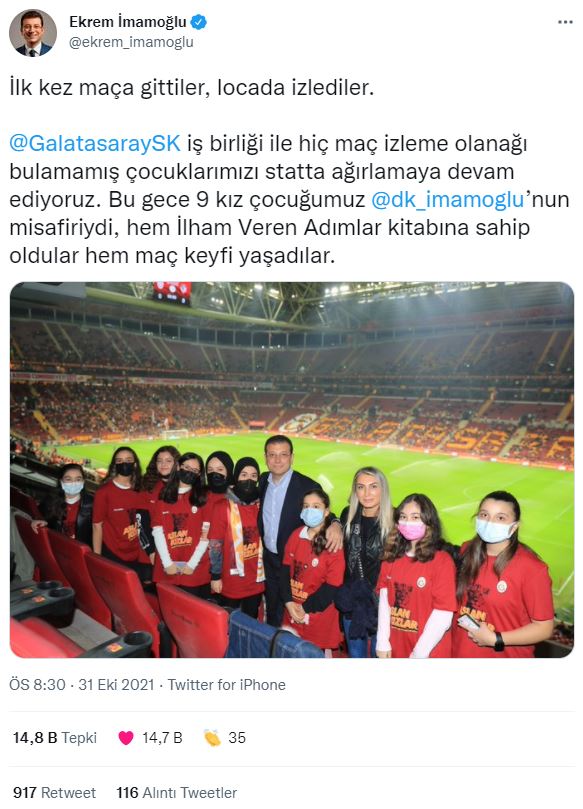 İmamoğlu yaptığı paylaşımda "İlk kez maça gittiler, locada izlediler. @GalatasaraySK iş birliği ile hiç maç izleme olanağı bulamamış çocuklarımızı statta ağırlamaya devam ediyoruz. Bu gece 9 kız çocuğumuz @dk_imamoglu’nun misafiriydi, hem İlham Veren Adımlar kitabına sahip oldular hem maç keyfi yaşadılar." ifadelerine yer verdi.
