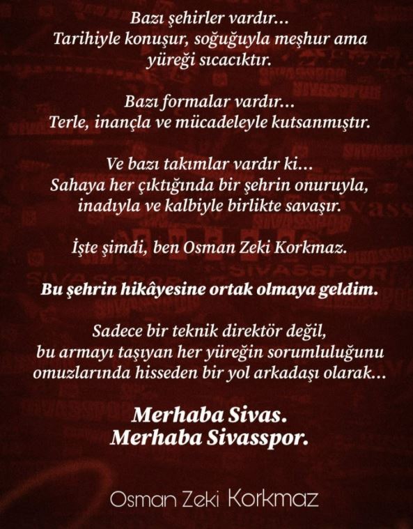 “Sadece bir teknik direktör değil, bu armayı taşıyan her yüreğin sorumluluğunu omuzlarında hisseden bir yol arkadaşı olarak... Merhaba Sivas. Merhaba Sivasspor.”
