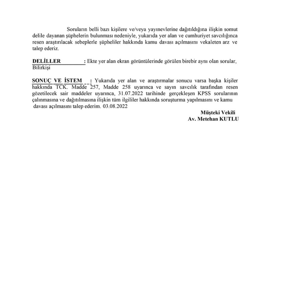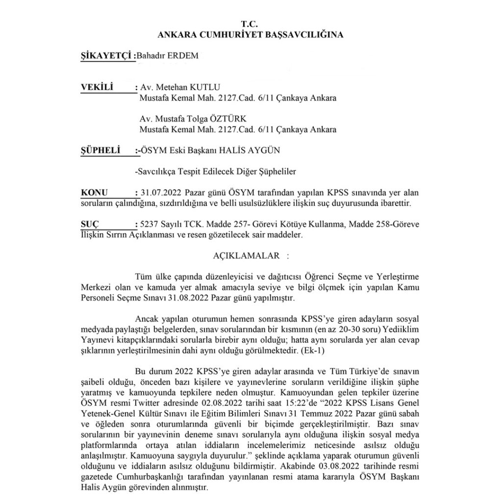 İYİ Parti Hukuk ve Adalet Politikaları Başkanı Bahadır Erdem'in ÖSYM başkanı ve diğer şüpheliler hakkında bulunduğu suç duyurusu şu şekilde: