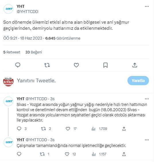Sivas - Yozgat arasında yoğun yağmur yağışı nedeniyle hızlı tren hattımızın kontrol ve denetimleri devam ettiğinden bugün (18.06.20023) Sivas - Yozgat arasında yolcularımızın seyahatleri geçici olarak otobüs aktarması ile yapılacaktır.