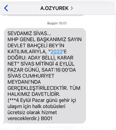 Ahmet Özyürek tarafından gönderilen mesajda, "Sevdamız Sivas... MHP Genel Başkanımız Sayın Devlet Bahçeli Bey'in katılımlarıyla 2023'e doğru: 'Aday Belli, Karar Net' Sivas mitingi 4 Eylül Pazar günü saat 16.00'da Sivas Cumhuriyet Meydanı'nda gerçekleştirilecektir. Tüm halkımız davetlidir. 4 Eylül Pazar günü şehir içi ulaşım için halk otobüsleri ücretsiz olarak hizmet verecektir." ifadeleri kullanıldı.