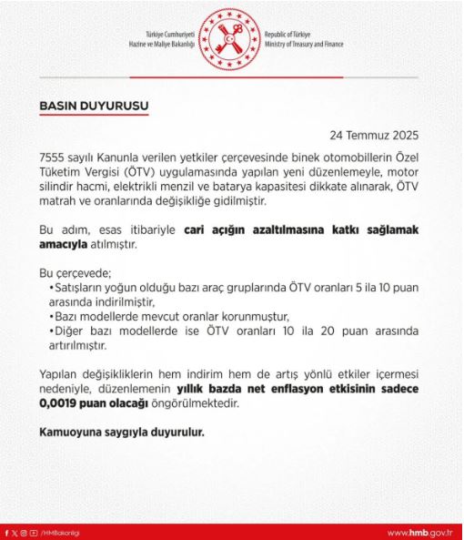 “7555 sayılı Kanunla verilen yetkiler çerçevesinde binek otomobillerin Özel Tüketim Vergisi (ÖTV) uygulamasında yapılan yeni düzenlemeyle, motor silindir hacmi, elektrikli menzil ve batarya kapasitesi dikkate alınarak, ÖTV matrah ve oranlarında değişikliğe gidilmiştir. Bu adım, esas itibariyle cari açığın azaltılmasına katkı sağlamak amacıyla atılmıştır.