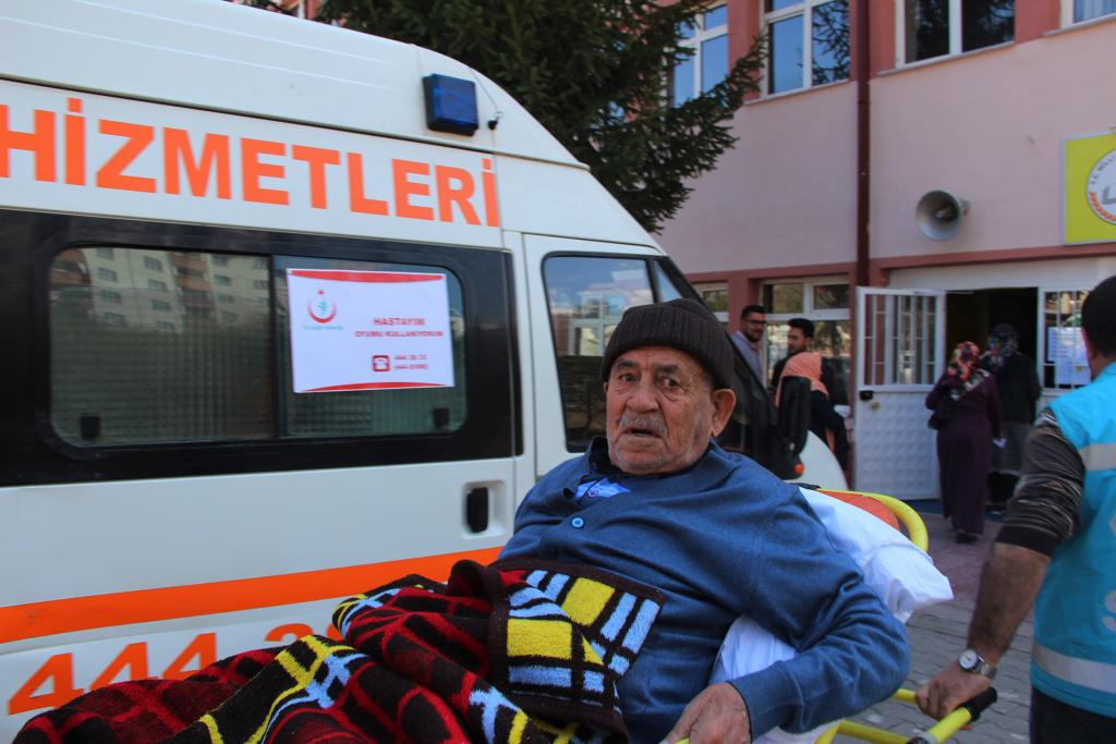 Belden aşağısı felçli olan 80 yaşındaki Mehmet Deveci de evde sağlık hizmetleri ekiplerinin yardımıyla sedyeyle taşınarak oy kullanacağı sandığın bulunduğu okula getirildi.