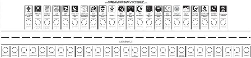 İstanbul'da 22 siyasi partinin ve 27 bağımsız adayın yarışacağı İBB Başkanlığı için basılan oy pusulası değişti. Yeni şablonda siyasi partilerle bağımsızlar arasındaki boşluk daha da belirginleşirken, araya “Bağımsız adaylar” ibaresi de eklendi.