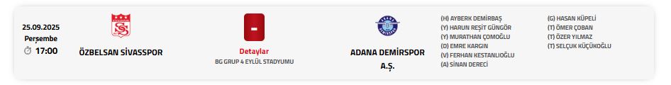 Trendyol 1. Lig’in 7. haftasında 25 Eylül Perşembe günü saat 17.00’de oynanacak Özbelsan Sivasspor – Adana Demirspor karşılaşmasının hakemleri Türkiye Futbol Federasyonu tarafından duyuruldu.