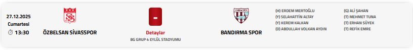 Ligde oynadığı son maçlarda istikrarlı bir performans sergileyen Özbelsan Sivasspor, kendi sahasında oynayacağı bu kritik mücadelede taraftar desteğini de arkasına almayı planlıyor. Bandırmaspor ise deplasmandan puan ya da puanlarla dönerek ligdeki konumunu güçlendirmeyi amaçlıyor.