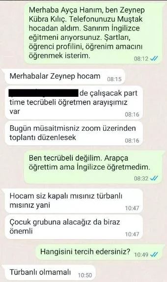 İstanbul'da özel bir eğitim kurumu, öğretmenlik için görüşme yapacağı kişiden "türbanlı olmamasını" istedi. Konuşmaya muhatap olan Zeynep Kübra Kılıç, WhatsApp yazışmalarının ekran görüntüsünü sosyal medya hesabından paylaşarak, "Hakkımızı nereden helal ediyorduk? Bugün yaşadığım bir olay" ifadesini kullandı.