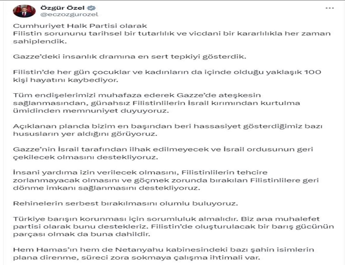 Özel, sosyal medya hesabından yaptığı paylaşımda, Cumhuriyet Halk Partisi’nin Filistin meselesini tarihsel bir tutarlılık ve vicdani bir kararlılıkla sahiplendiğini belirtti. Gazze’deki insanlık dramına en sert tepkiyi gösterdiklerini hatırlatan Özel, “Gazze’de ateşkesin sağlanmasından, günahsız Filistinlilerin İsrail kırımından kurtulma ümidinden memnuniyet duyuyoruz” ifadelerini kullandı.