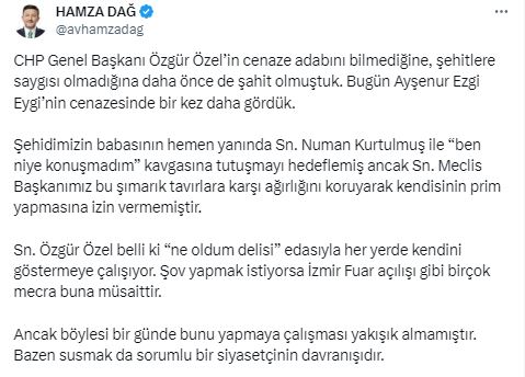 "CHP Genel Başkanı Özgür Özel’in cenaze adabını bilmediğine, şehitlere saygısı olmadığına daha önce de şahit olmuştuk. Bugün Ayşenur Ezgi Eygi’nin cenazesinde bir kez daha gördük.