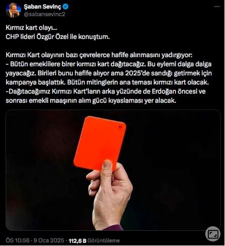 "Bütün emeklilere birer kırmızı kart dağıtacağız. Bu eylemi dalga dalga yayacağız. Birileri bunu hafife alıyor ama 2025’de sandığı getirmek için kampanya başlattık. Bütün mitinglerin ana teması kırmızı kart olacak.