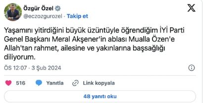 Özel, paylaşımında "Yaşamını yitirdiğini büyük üzüntüyle öğrendiğim İYİ Parti Genel Başkanı Meral Akşener'in ablası Mualla Özen'e Allah'tan rahmet, ailesine ve yakınlarına başsağlığı diliyorum" ifadelerini kullandı.