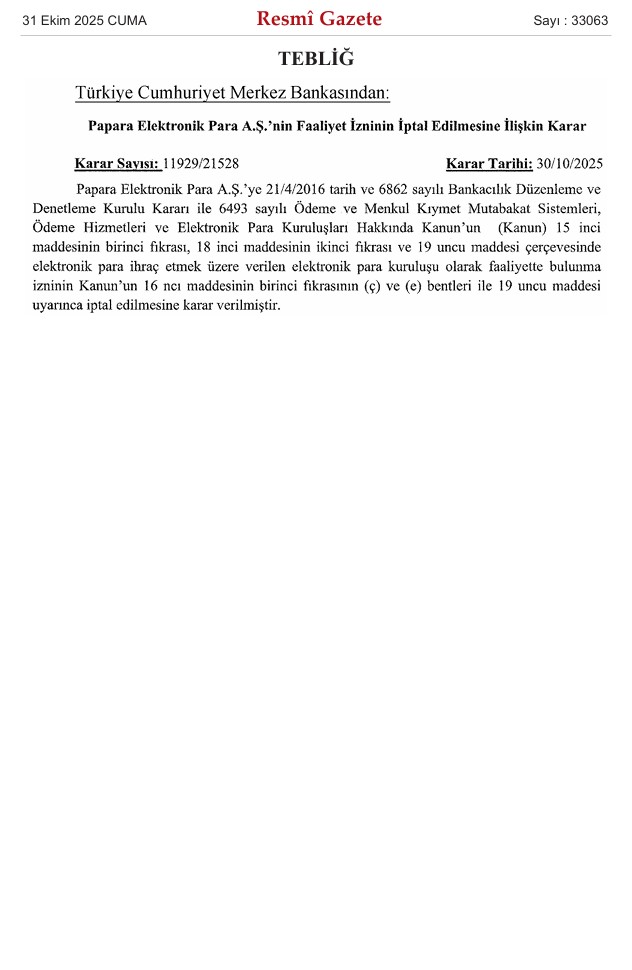Merkez Bankası tarafından yayımlanan tebliğe göre, Papara Elektronik Para A.Ş.’ye 21 Nisan 2016 tarihli ve 6862 sayılı Bankacılık Düzenleme ve Denetleme Kurulu (BDDK) kararıyla verilen elektronik para kuruluşu olarak faaliyette bulunma izni iptal edildi.