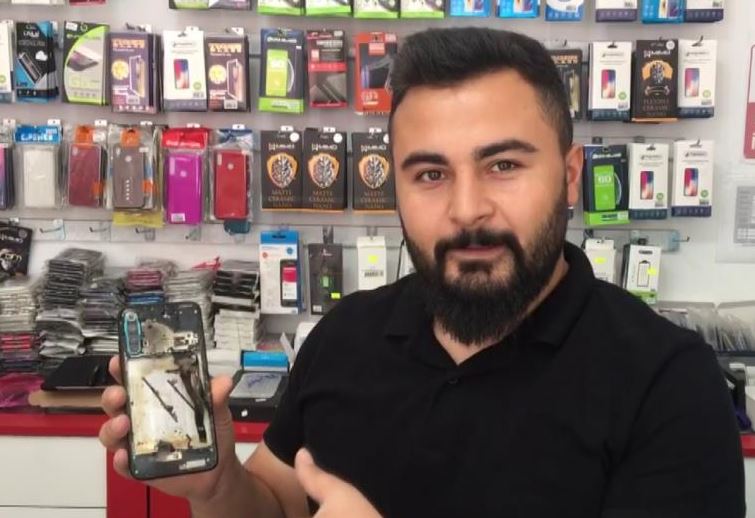 Dükkan sahibi Yasin Kaya, telefonun geldiğinde bataryasında şişlik olduğunu söyleyerek, “Cihazımız batarya şikayetiyle gelmişti, şişmişti bataryası arka kapağını sökmek için ısıtıcıya koymamız gerekiyordu, cihazı ısıtıcıya koydum beklerken bir anda bir patlama sesi geldi burada ısıtıcı cihazından ben burada bilgisayardaki işlerimi hallederken.