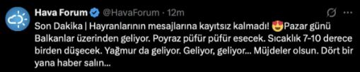 Hava olaylarını sosyal medyada takipçileriyle paylaşan Hava Forum, Pazar günü etkili olacak hava değişimini şu ifadelerle duyurdu: