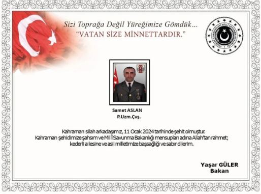Milli Savunma Bakanı Yaşar Güler de şehit Aslan için başsağlığı mesajı yayımladı.
