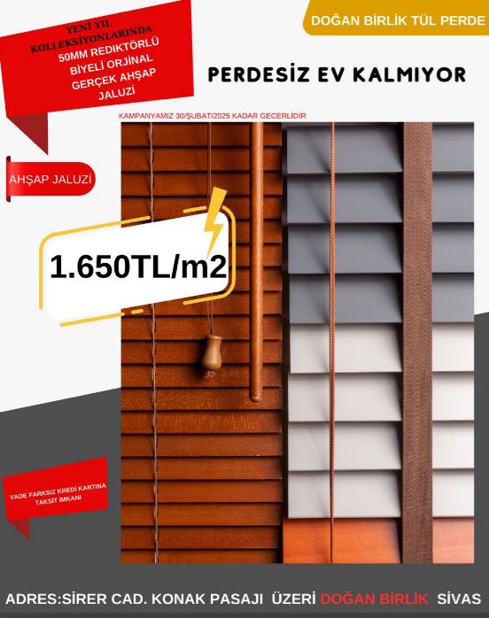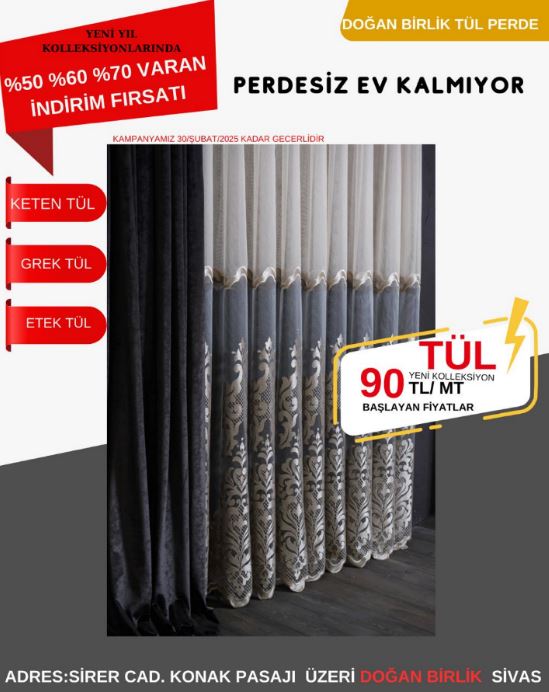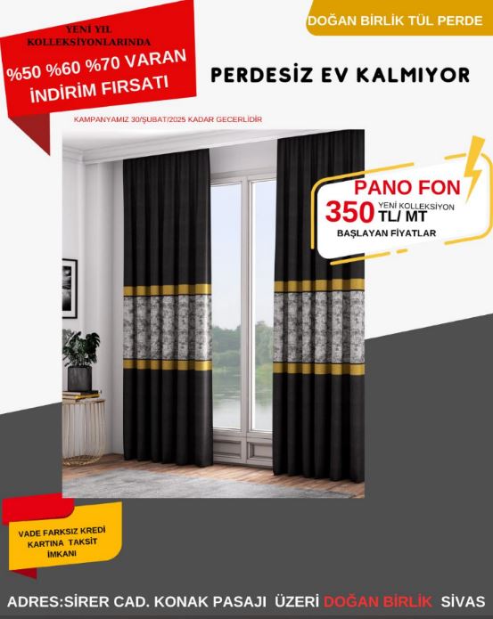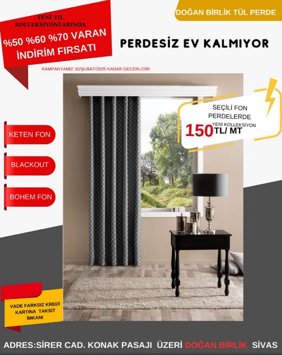 Doğan Birlik, Sivaslılar için dev bir kampanya başlattı. Kampanya kapsamında perde ürünlerinde yüzde 50, 60 ve 70’e varan indirim fırsatları sunuluyor. Ayrıca vade farksız kredi kartına taksit imkânı ile herkesin bütçesine uygun seçenekler sağlanıyor. Kampanya, Sivaslıların yoğun ilgisiyle karşılanması bekleniyor.