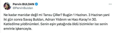 Ne kadar manidar değil mi Tansu Çiller? Bugün 1 Haziran. 3 Haziran yani iki gün sonra Savaş Buldan, Adnan Yıldırım ve Hacı Karay’ın 30. katledilme yıldönümleri. Senin eşin yatağında öldü bizimkiler ise senin emrinle işkenceyle.