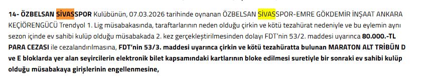 PFDK tarafından yapılan açıklamaya göre, 7 Mart 2026 tarihinde oynanan Özbelsan Sivasspor – Emre Gökdemir İnşaat Ankara Keçiörengücü müsabakasında taraftarların gerçekleştirdiği çirkin ve kötü tezahüratlar nedeniyle kulüp disipline sevk edildi. Aynı eylemin sezon içinde ev sahibi olunan müsabakada ikinci kez gerçekleştirilmesi nedeniyle kulübe FDT’nin 53/2 maddesi uyarınca 80 bin lira para cezası verildi.