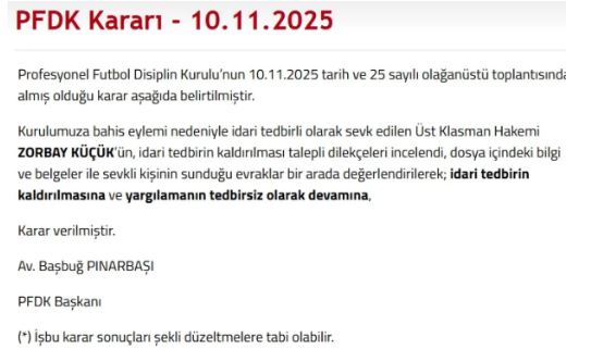“Kurulumuza bahis eylemi nedeniyle idari tedbirli olarak sevk edilen Üst Klasman Hakemi Zorbay Küçük’ün, idari tedbirin kaldırılması talepli dilekçeleri incelendi. Dosya içindeki bilgi ve belgeler ile sevkli kişinin sunduğu evraklar bir arada değerlendirilerek; idari tedbirin kaldırılmasına ve yargılamanın tedbirsiz olarak devamına karar verilmiştir.”