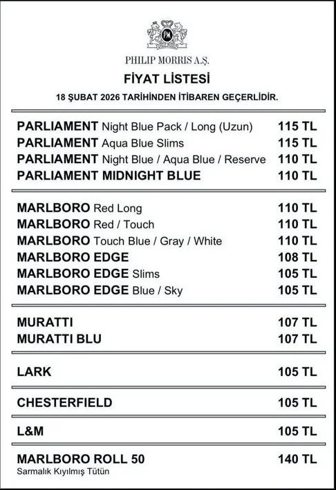 Philip Morris grubuna ait sigaralara 18 Şubat 2026 tarihinden itibaren geçerli olmak üzere zam yapıldı. Güncellenen fiyat listesine göre Parliament Night Blue Pack ve Aqua Blue Slims ürünleri 115 TL’ye yükseldi. Parliament Night Blue, Aqua Blue ve Reserve ile Midnight Blue çeşitlerinin fiyatı ise 110 TL olarak belirlendi.