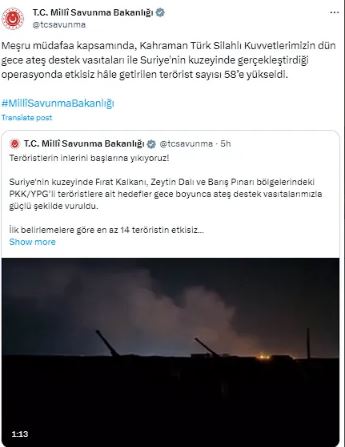 Bakanlık, "Meşru müdafaa kapsamında, Kahraman Türk Silahlı Kuvvetlerimizin dün gece ateş destek vasıtaları ile Suriye'nin kuzeyinde gerçekleştirdiği operasyonda etkisiz hâle getirilen terörist sayısı 58’e yükseldi." açıklamasında bulundu.