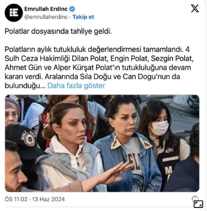 Erdinç paylaşımında "Polatlar'ın aylık tutukluluk değerlendirmesi tamamlandı. 4 Sulh Ceza Hakimliği Dilan Polat, Engin Polat, Sezgin Polat, Ahmet Gün ve Alper Kürşat Polat’ın tutukluluğuna devam kararı verdi. Aralarında Sıla Doğu ve Can Dogu’nun da bulunduğu tutukluların ise tutuksuz yargılanmasına hükümetti. Başka davadan tutukluluğu olmayan sanıklar cezaevinden tahliye edilecekler." ifadelerini kullandı.