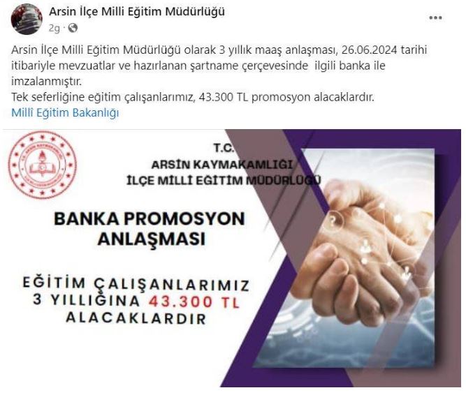 Bu kapsamda Trabzon Arsin'deki İlçe Milli Eğitim Müdürlüğü personeline yönelik olarak sağlanan maaş promosyonu da dikkat çekti.