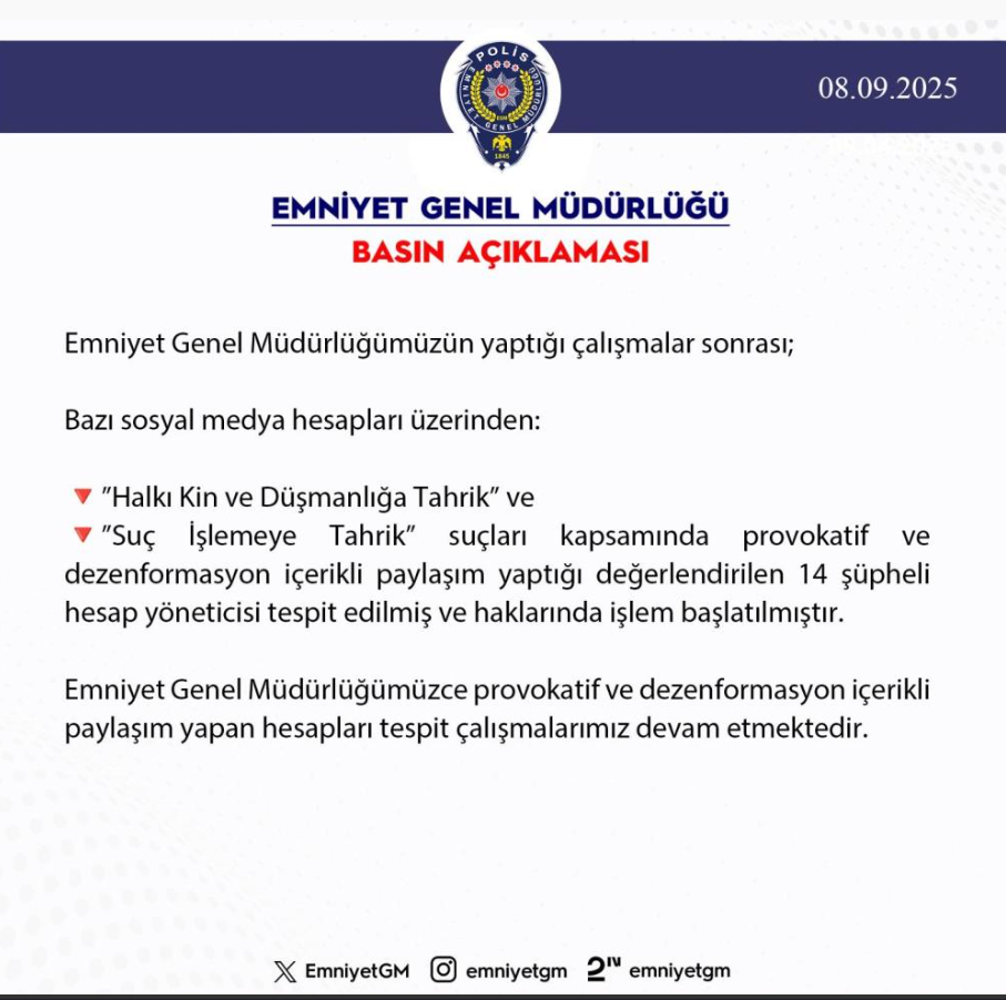 Emniyet Genel Müdürlüğü’nün sosyal medya hesabından yapılan açıklamada, “Emniyet Genel Müdürlüğümüzün yaptığı çalışmalar sonrası; bazı sosyal medya hesapları üzerinden, ‘Halkı Kin ve Düşmanlığa Tahrik’ ve ‘Suç İşlemeye Tahrik’ suçları kapsamında provokatif ve dezenformasyon içerikli paylaşım yaptığı değerlendirilen 14 şüpheli hesap yöneticisi tespit edilmiş ve haklarında işlem başlatılmıştır.” denildi.