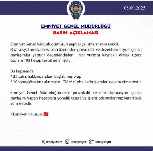 “Emniyet Genel Müdürlüğümüzün yaptığı çalışmalar sonrası; bazı sosyal medya hesapları üzerinden provokatif ve dezenformasyon içerikli paylaşım yaptığı değerlendirilen, 16’sı yurt dışı kaynaklı olmak üzere toplam 103 hesap tespit edilmiştir. Bu kapsamda 39 şahıs hakkında işlem başlatılmış olup, 10 şahıs gözaltına alınmıştır. Diğer şüphelilerin işlemleri devam etmektedir.”