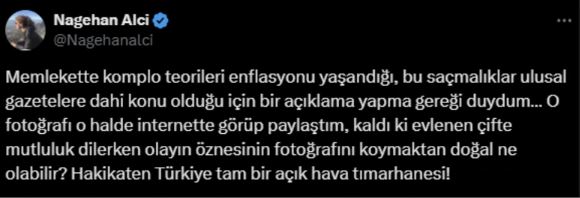 “Memlekette komplo teorileri enflasyonu yaşandığı, bu saçmalıklar ulusal gazetelere dahi konu olduğu için bir açıklama yapma gereği duydum… O fotoğrafı o halde internette görüp paylaştım, kaldı ki evlenen çifte mutluluk dilerken olayın öznesinin fotoğrafını koymaktan doğal ne olabilir? Hakikaten Türkiye tam bir açık hava tımarhanesi!”