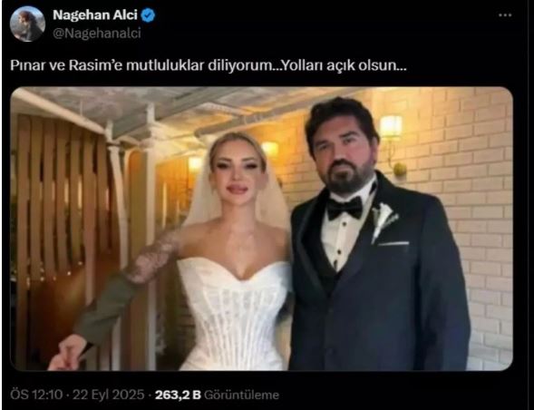 Evliliğin ardından eski eşi Rasim Ozan Kütahyalı’yı sosyal medya hesabından tebrik eden Nagehan Alçı, çiftin nikah fotoğrafını paylaşarak, “Pınar ve Rasim’e mutluluklar diliyorum… Yolları açık olsun” ifadelerini kullandı. Ancak Alçı’nın paylaştığı karede nikah şahidi avukat Merve Uçanok’un fotoğraftan silinmiş olması dikkatlerden kaçmadı.