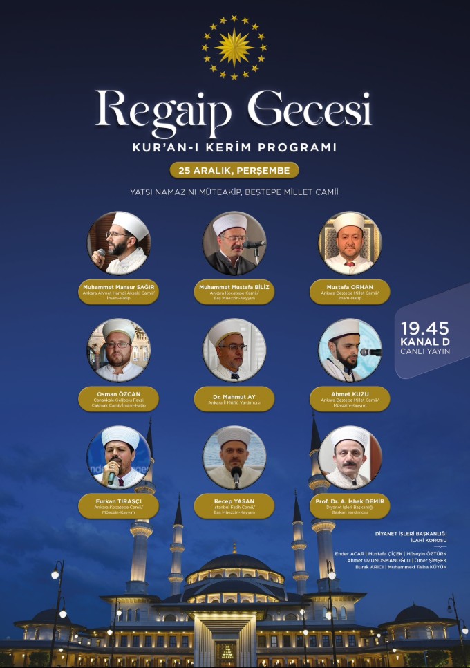 T.C. Cumhurbaşkanlığı tarafından yapılan açıklamaya göre, 25 Aralık Perşembe günü Beştepe Millet Camii’nde Regaip Gecesi’ne özel bir program düzenlenecek.