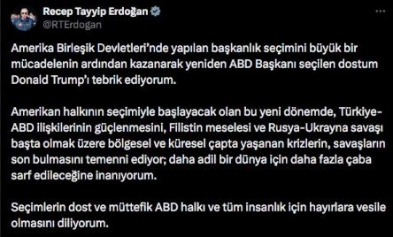 Erdoğan X platformundan yaptığı açıklamada "Amerika Birleşik Devletleri’nde yapılan başkanlık seçimini büyük bir mücadelenin ardından kazanarak yeniden ABD Başkanı seçilen dostum Donald Trump’ı tebrik ediyorum. Amerikan halkının seçimiyle başlayacak olan bu yeni dönemde, Türkiye-ABD ilişkilerinin güçlenmesini, Filistin meselesi ve Rusya-Ukrayna savaşı başta olmak üzere bölgesel ve küresel çapta yaşanan krizlerin, savaşların son bulmasını temenni ediyor; daha adil bir dünya için daha fazla çaba sarf edileceğine inanıyorum. Seçimlerin dost ve müttefik ABD halkı ve tüm insanlık için hayırlara vesile olmasını diliyorum." ifadelerine yer verdi.