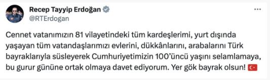 Cennet vatanımızın 81 vilayetindeki tüm kardeşlerimi, yurt dışında yaşayan tüm vatandaşlarımızı evlerini, dükkanlarını, arabalarını Türk bayraklarıyla süsleyerek Cumhuriyetimizin 100’üncü yaşını selamlamaya, bu gurur gününe ortak olmaya davet ediyorum. Yer gök bayrak olsun! (Haber Merkezi)