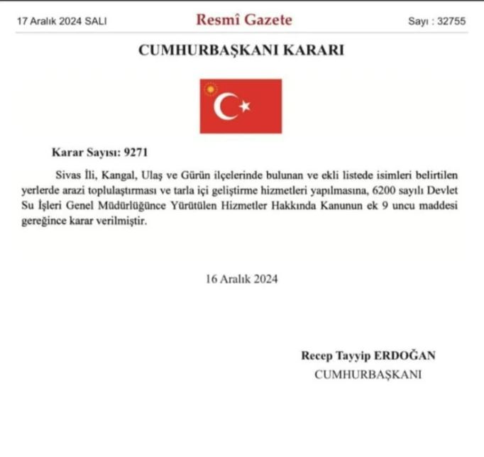 Cumhurbaşkanı imzası ve Resmi Gazete de yayınlanan karar ile Kangal, Gürün ve Ulaş ilçelerine bağlı 33 köyde arazi toplulaştırması gerçekleştirilecek.