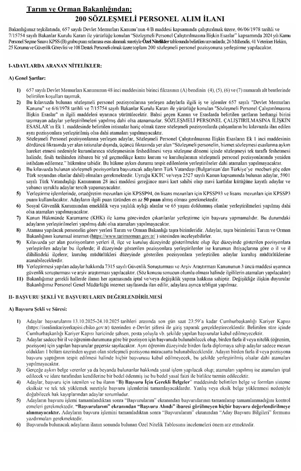Tarım ve Orman Bakanlığı, 657 sayılı Devlet Memurları Kanunu’nun 4/B maddesi kapsamında 200 sözleşmeli personel alımı yapacağını duyurdu.