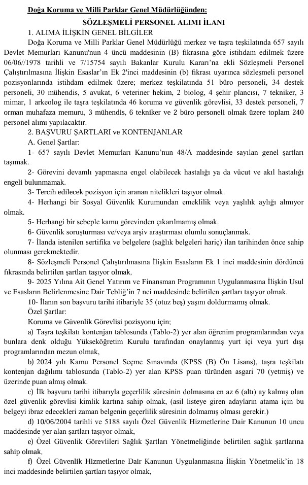 Doğa Koruma ve Milli Parklar Genel Müdürlüğü, merkez ve taşra teşkilatında görevlendirilmek üzere 240 sözleşmeli personel alımı yapacağını duyurdu.