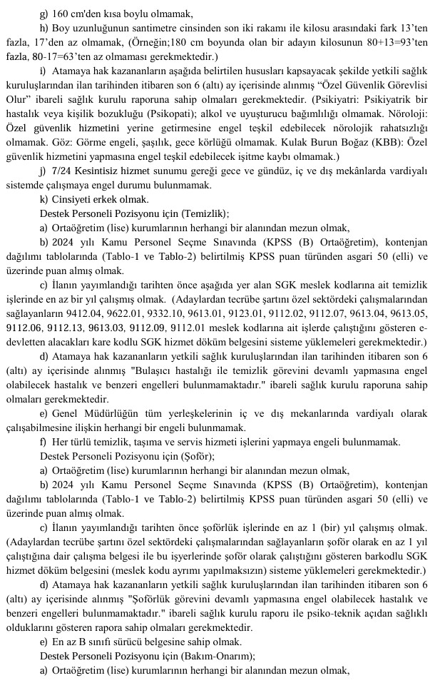 Koruma ve güvenlik görevlisi alımlarında adayların ilgili yükseköğretim programlarından mezun olmaları, 2024 KPSS’den en az 70 puan almaları, geçerli özel güvenlik kimlik kartına sahip olmaları ve sağlık şartlarını karşılamaları gerekiyor.