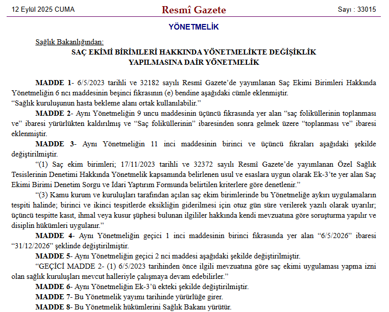 Sağlık Bakanlığı tarafından hazırlanan “Saç Ekimi Birimleri Hakkında Yönetmelikte Değişiklik Yapılmasına Dair Yönetmelik” Resmî Gazete’de yayımlandı.
