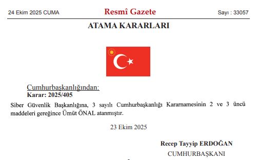 Cumhurbaşkanı Recep Tayyip Erdoğan imzasıyla yayımlanan karara göre, Siber Güvenlik Başkanlığına Ümüt Önal getirildi.