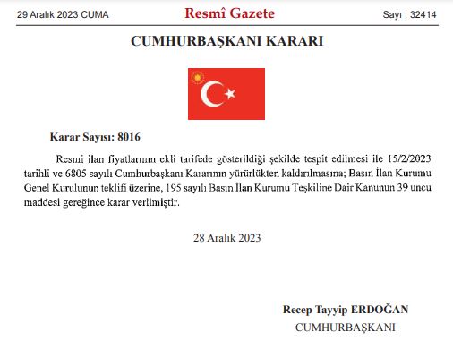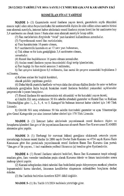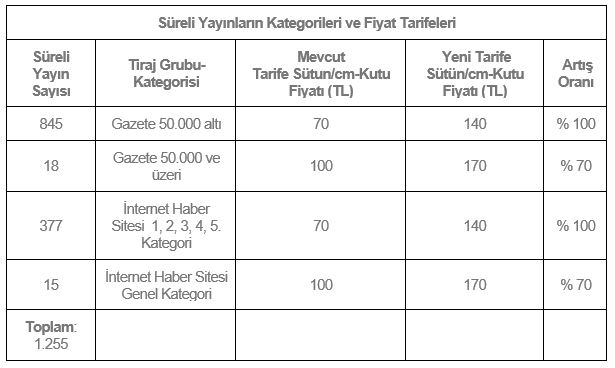 29 Aralık 2023 tarihli ve 32414 sayılı Resmî Gazete’de yayımlanan ve 1 Ocak 2024 tarihinde yürürlüğe girecek olan Resmî İlan Fiyat Tarifesi, günlük fiili satışı 50 bin adedin altında olan gazeteler ile 1, 2, 3, 4 ve 5. Kategoride yer alan internet haber siteleri için yüzde 100 artışla KDV hariç 70 TL’den 140 TL’ye; günlük fiili satışı 50 bin adedin üzerinde olan gazeteler ile Genel Kategorideki internet haber siteleri için ise yüzde 70 artışla KDV hariç 100 TL’den 170 TL’ye çıkmış oldu.