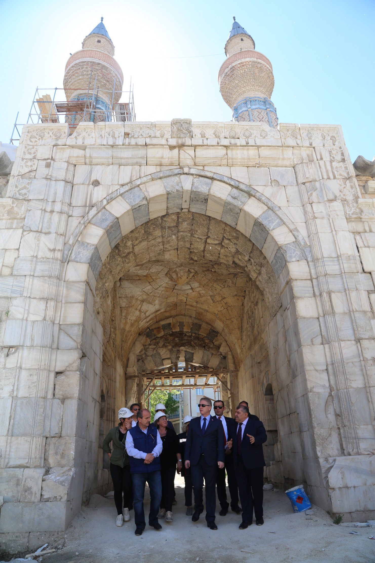 Cami incelemelerinin ardından restorasyonu devam eden Selçuklu şaheseri Gökmedrese'yi de ziyaret eden Vali Gül, çalışmaların son durumu ve gelinen aşama hakkında teknik personellerden bilgi edindi.