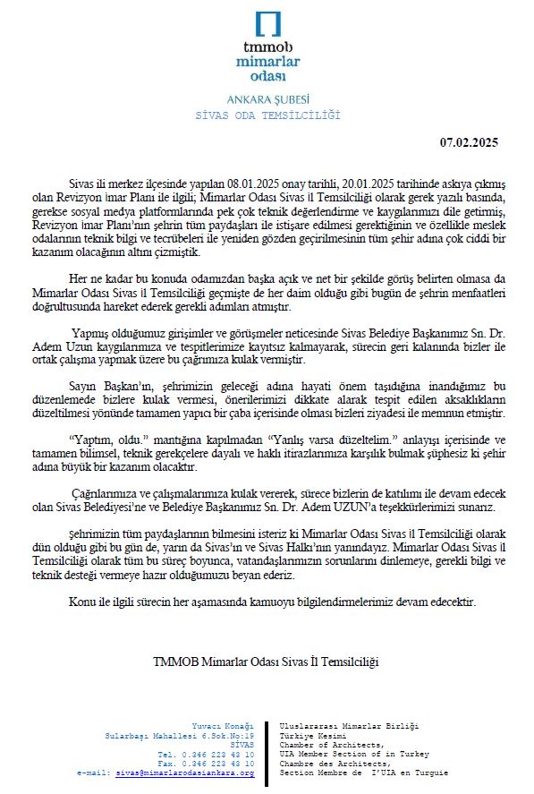 Mimarlar Odası Sivas İl Temsilciliği, yaptığı görüşmeler neticesinde Sivas Belediye Başkanı Dr. Adem Uzun’un çağrılarına kayıtsız kalmadığını ve sürecin geri kalanında kendileriyle ortak çalışma yapılacağını açıkladı.