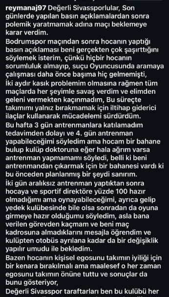 "Bu hafta 3 gün antrenmanlara katılamadım. Tedavimden dolayı ve 4. gün antrenmana çıkabileceğimi söyledim. Ama hocam bir bahane bulup kulüp doktoruna eğer ağrıların varsa antrenman yapmamanı söyledi. Belki iki antrenman eksik antrenmanla bir şey olmazdı ama oynamama engel bir sebep sayılmadı."