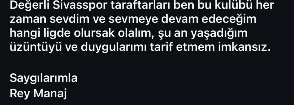 Trendyol Süper Lig’in 36. haftasında Samsunspor karşısında alınan mağlubiyetin ardından küme düşen Sivasspor’da, takımın en golcü oyuncularından Rey Manaj sosyal medya hesabından dikkat çeken bir açıklamada bulundu.