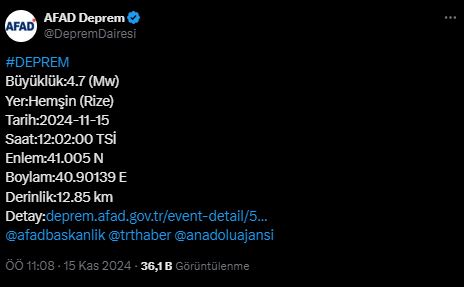 AFAD verilerine göre Rize'de 4,7 büyüklüğünde deprem meydana geldi.