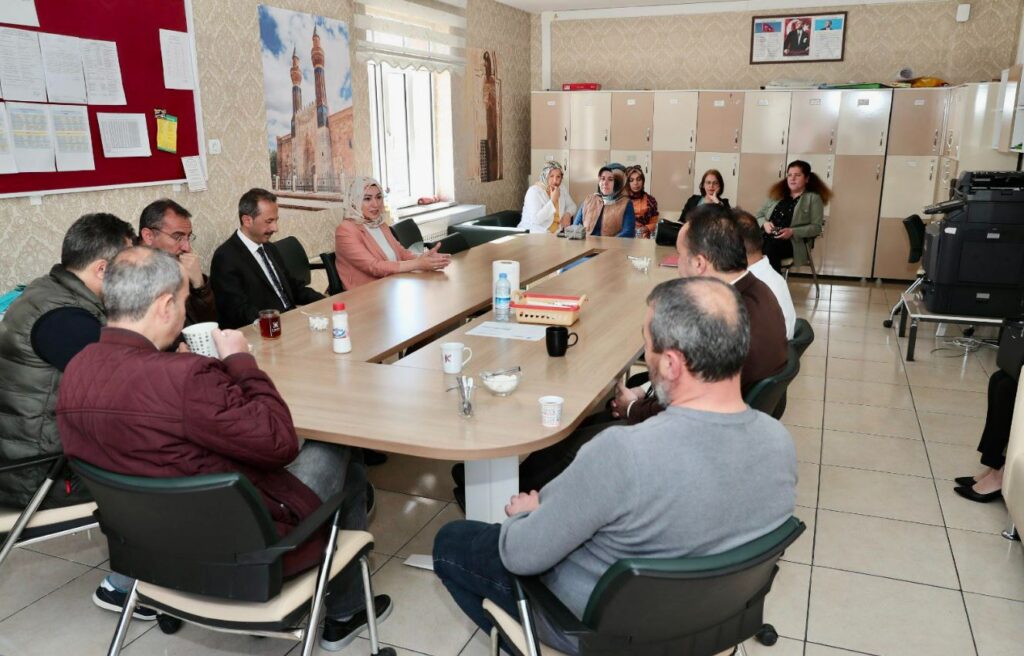 📌 Başöğretmen Atatürk Ortaokulu okullarını ziyaret eden Rukiye Toy, talep ve istekleri dinlerken 14 Mayıs seçimlerinde destek istedi. (Emre Gençleşen)
