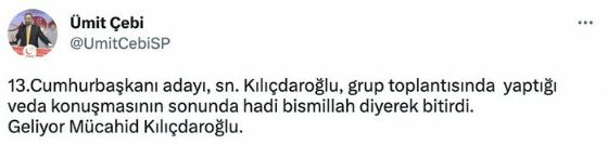 Sosyal medya hesabı üzerinden paylaşım yapan Ümit Çebi, Kılıçdaroğlu'nu 'mücahid' olarak nitelendirdi.